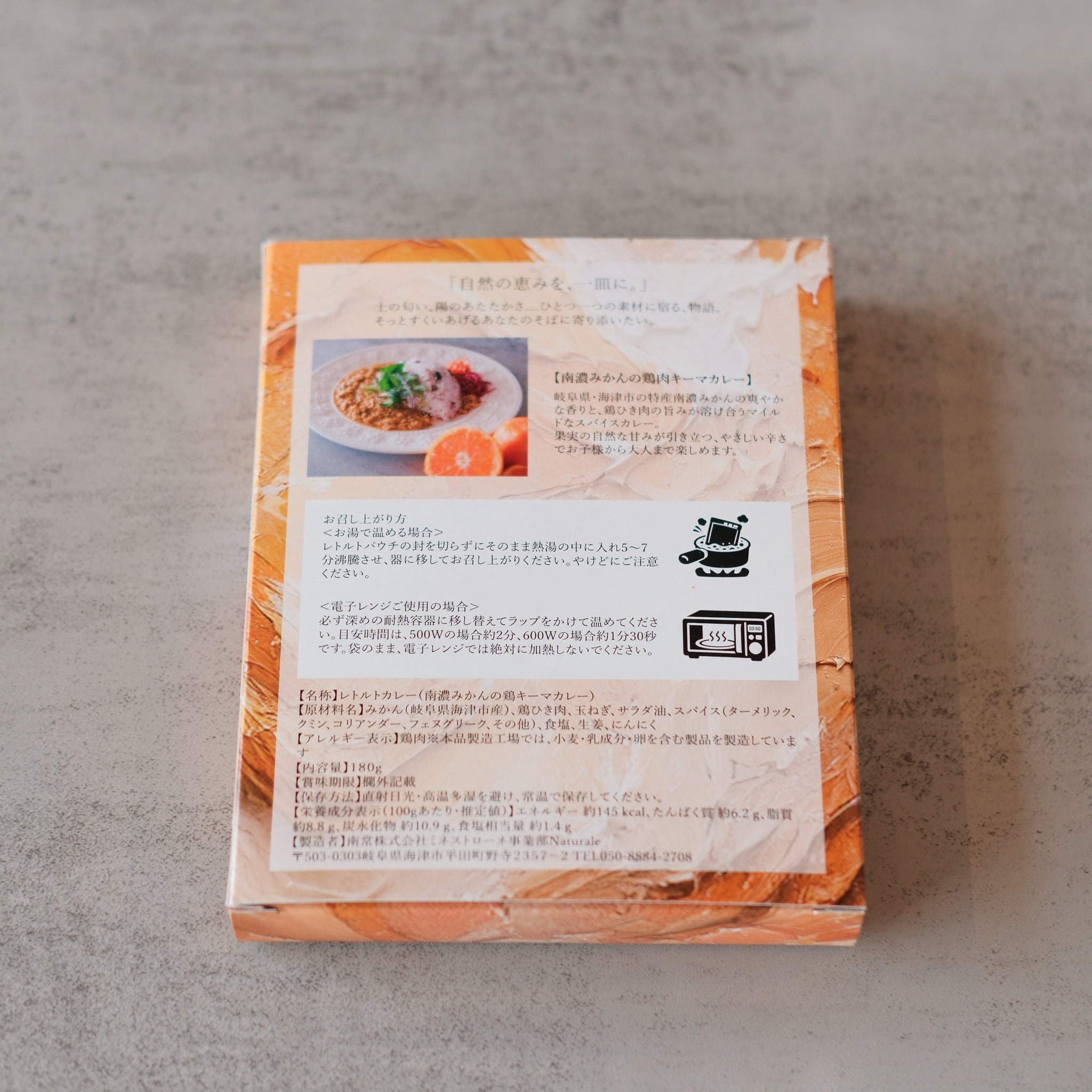 【原材料】みかん(岐阜県海津市産)、鶏ひき肉、玉ねぎ、サラダ油、スパイス(ターメリック、クミン、コリアンダー、フェヌグリーク、その他)、食塩、生姜、にんにく
