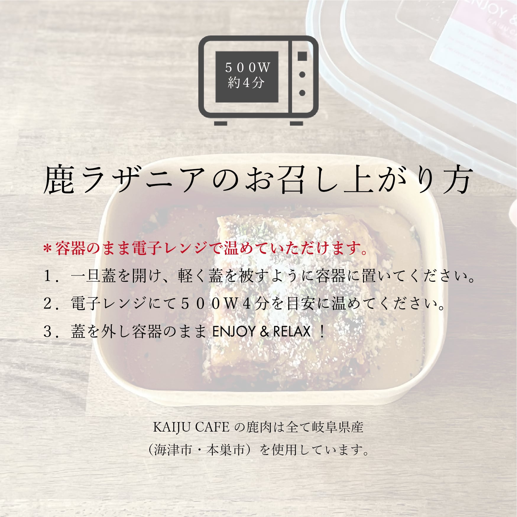 【ラグーソース】鹿肉(岐阜県産)、玉ねぎ、にんじん、セロリ、ホールトマト、赤ワイン、オリーブオイル、ハーブ・スパイス類、塩【ベシャメルソース】牛乳、バター、小麦粉、塩【その他】パスタ、チーズ、ホールトマト